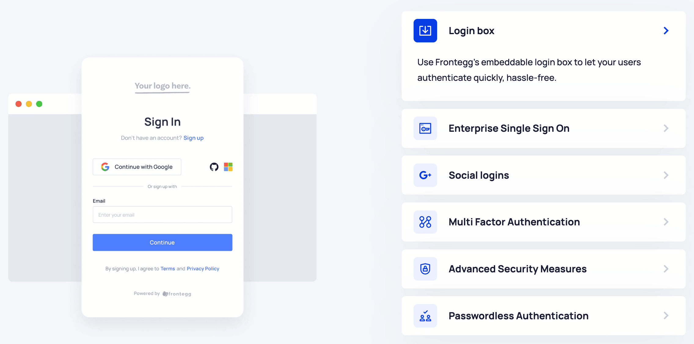 Made for developers, the Frontegg multi-tenant platform gives users full visibility and granular control over their personal and organizational settings through its self-serve Admin Portal. It supports application developers by managing base-level authentication flows, complex organizational structures, fine-grained authorization, API-token management, SSO, and much more.